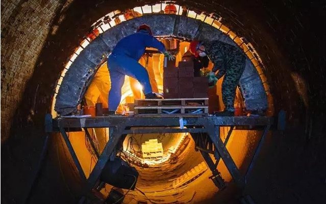 ④大碹的鎖磚要求高出碹頂100-150mm,同一節(jié)大碹要求鎖磚同時打入,使整個碹受力均勻。